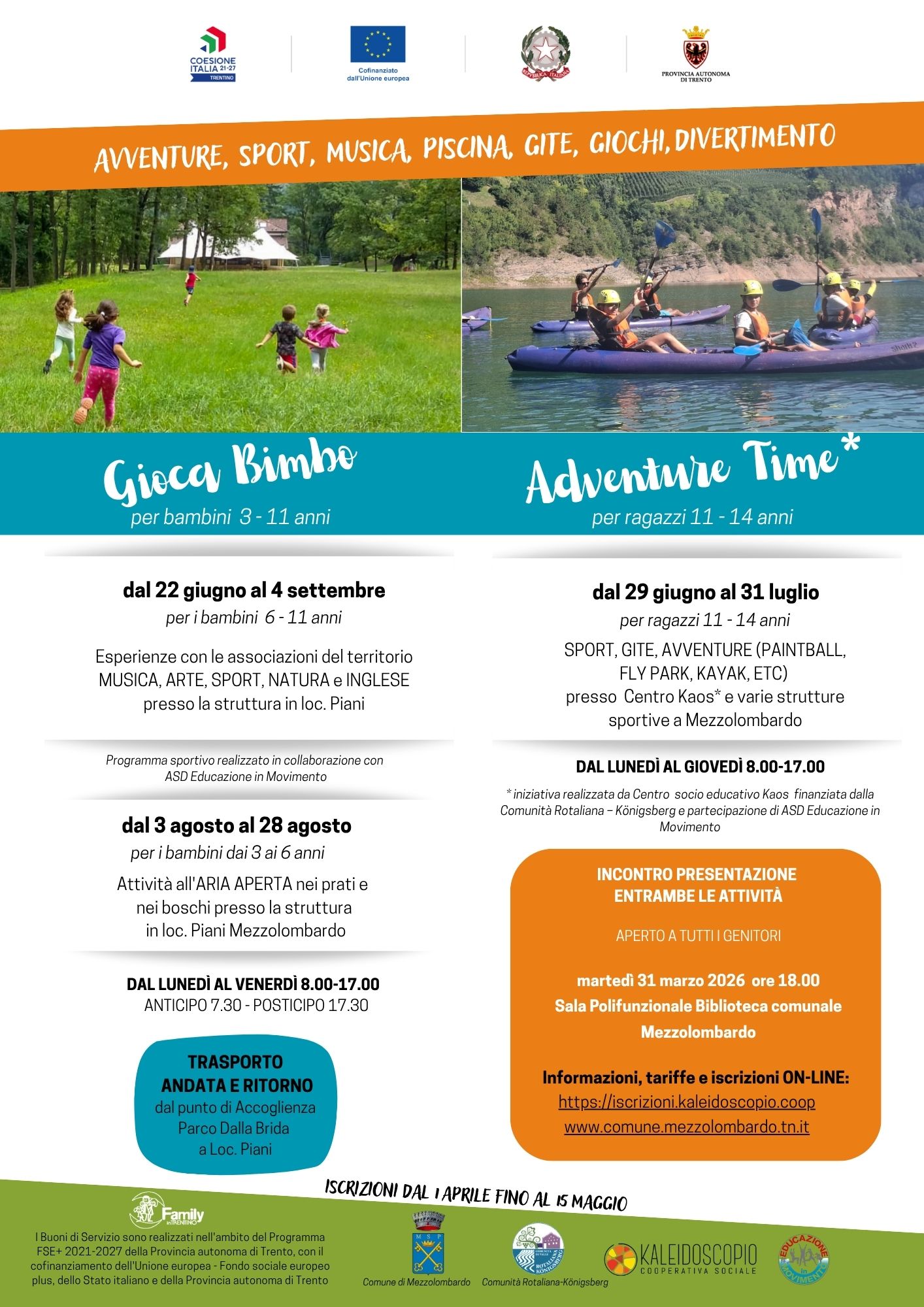 La colonia estiva diurna “Gioca Bimbo” è un’iniziativa del Comune di Mezzolombardo, in gestione alla Cooperativa Kaleidoscopio, che si terrà nel periodo dal 22 giugno al 4 settembre 2026 (ad esclusione della settimana di Ferragosto) in loc. Ai Piani a beneficio dei bambini di età compresa tra i tre e gli undici anni (dal primo anno della Scuola Materna al quinto anno della Scuola Elementare).